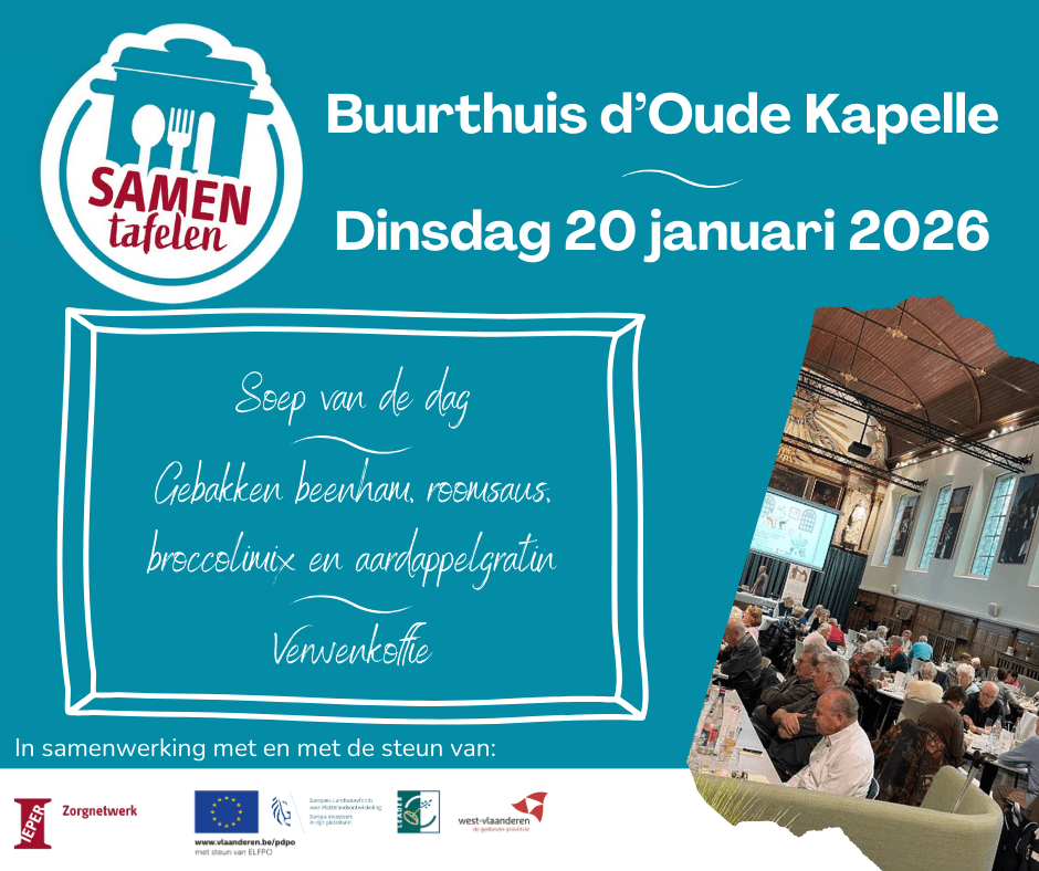 Elke derde dinsdag van de maand ben je welkom in het Buurthuis d'Oude Kapelle voor een lekkere en gezonde maaltijd. Voor de democratische prijs van 20 euro verkrijg je een lekker driegangenmenu met aperitief. De gezelligheid krijg je er gratis bij! Deuren gaan open om 11u.