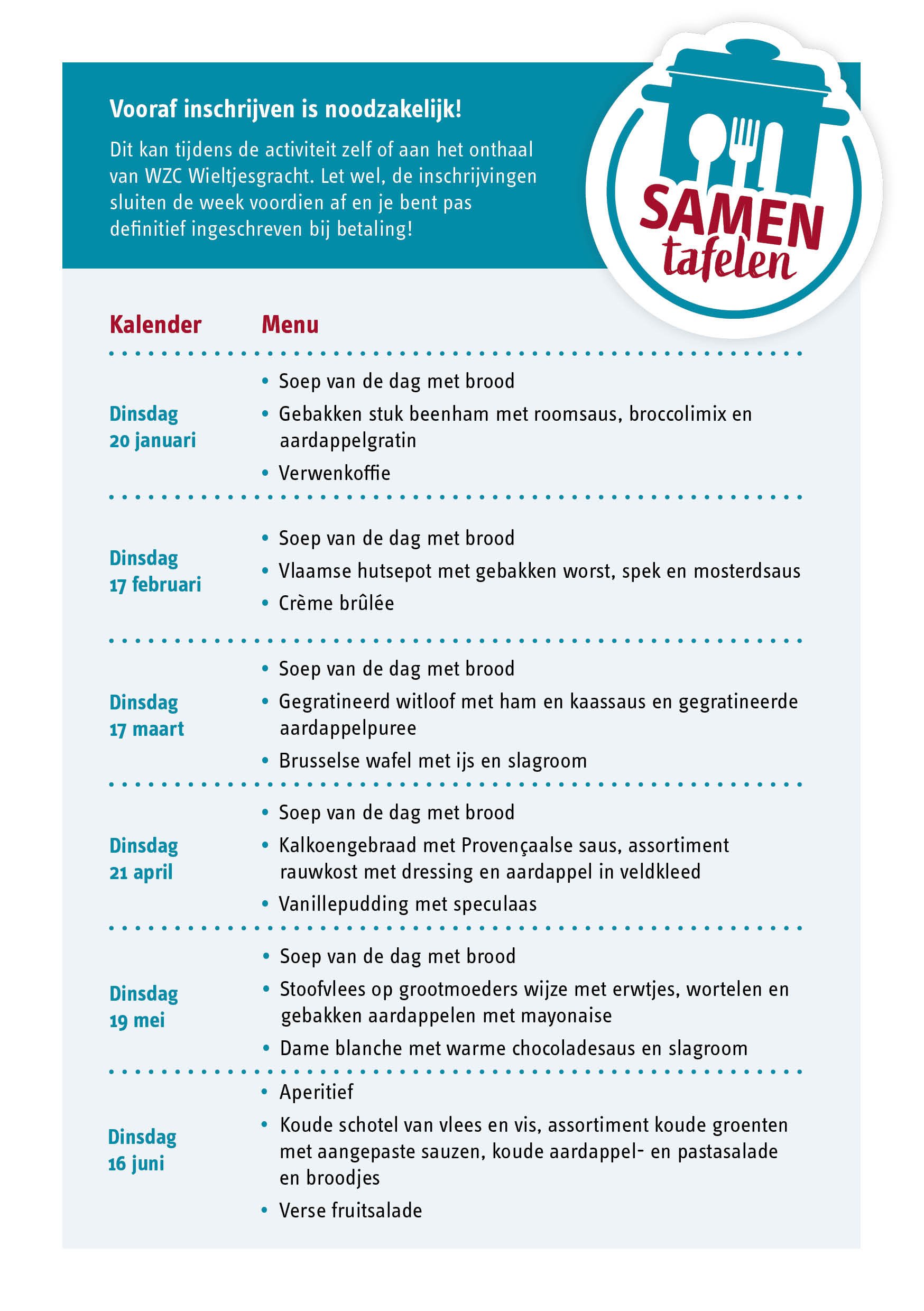 Vooraf inschrijven en betalen is verplicht, dit kan via e-mail, 057/69.05.86, in het buurthuis tijdens 1 van de andere activiteiten of via het onthaal van Wieltjesgracht.
