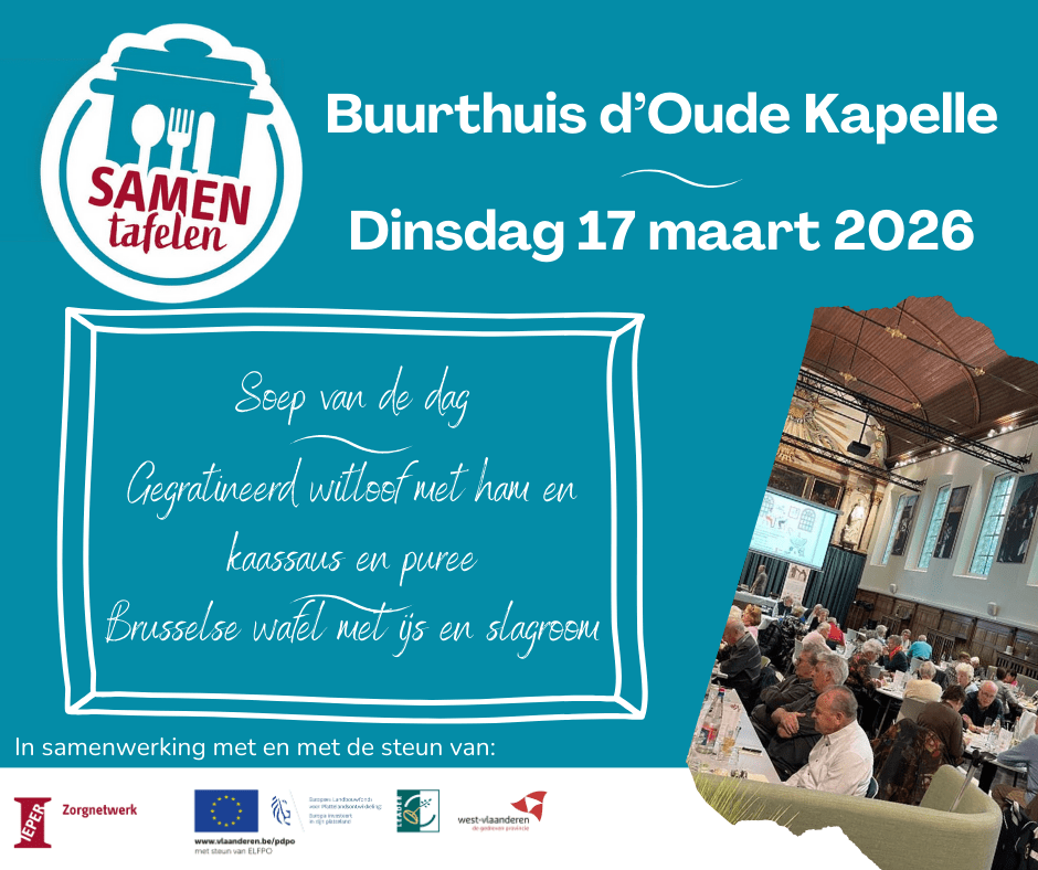 Elke derde dinsdag van de maand ben je welkom in het Buurthuis d'Oude Kapelle voor een lekkere en gezonde maaltijd. Voor de democratische prijs van 20 euro verkrijg je een lekker driegangenmenu met aperitief. De gezelligheid krijg je er gratis bij! Deuren gaan open om 11u.
