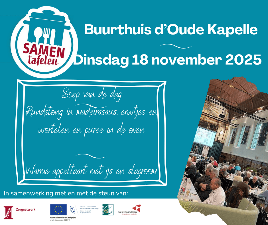 Elke derde dinsdag van de maand ben je welkom in het Buurthuis d'Oude Kapelle voor een lekkere en gezonde maaltijd. Voor de democratische prijs van 20 euro verkrijg je een lekker driegangenmenu met aperitief. De gezelligheid krijg je er gratis bij! Deuren gaan open om 11u.